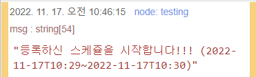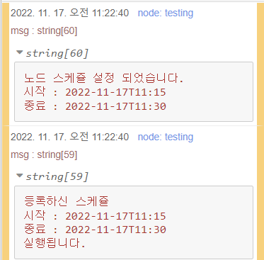 node.warn("등록하신 스케쥴\n시작 : " + start + '\n종료 : ' + end + '\n실행됩니다.');