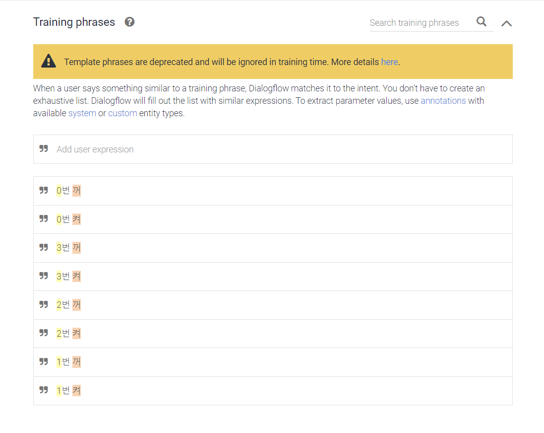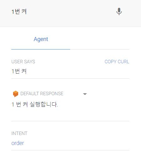 위와 같이 성공적으로 인식된다. 사실 Training phrases 에 1번 켜 / 1번 꺼 두 가지만 추가해도