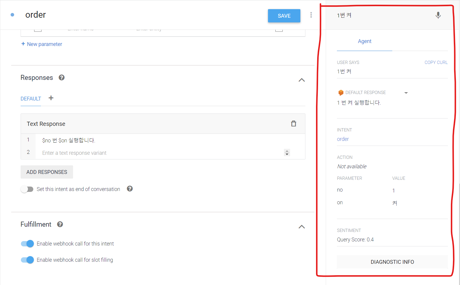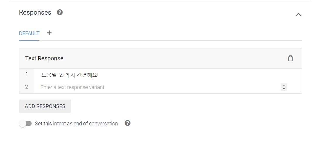 기본제공 Intent 중 Default Welcome Intent 를 위와 같이 수정.