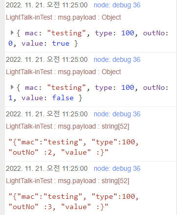 두번째 메시지는 이전에 노드를 설정했을 때 한 번 체크했다가 풀었더니 JSON으로 들어온 모습이다.