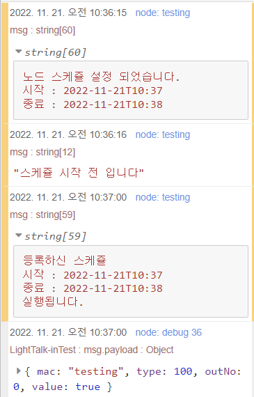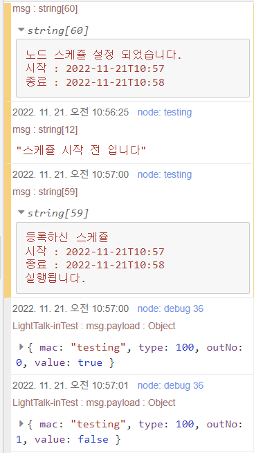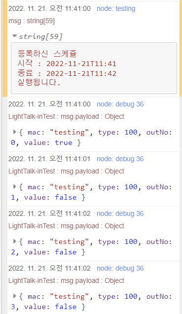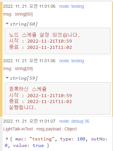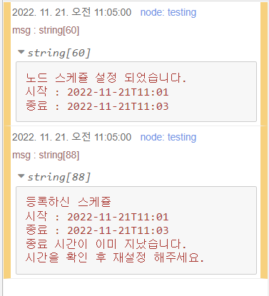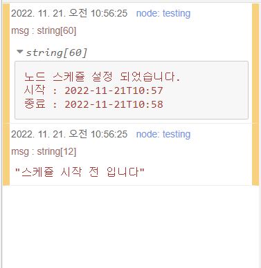 node.warn("등록하신 스케쥴\n시작 : " + start + '\n종료 : ' + end + '\n실행됩니다.');