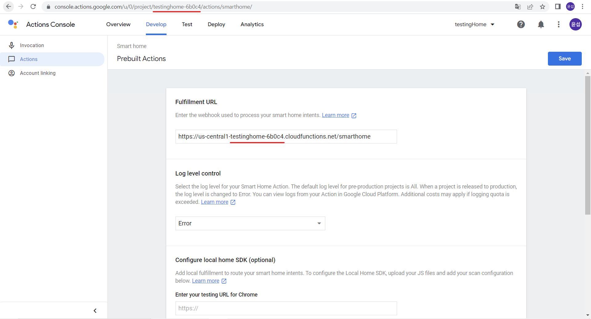 6. Develop / Actions 에서 Fulfillment URL 입력