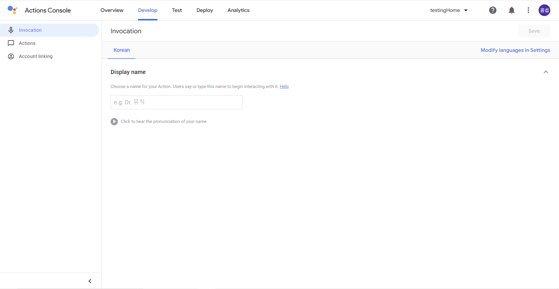 5. Develop / Invocation 에서 이름 설정
