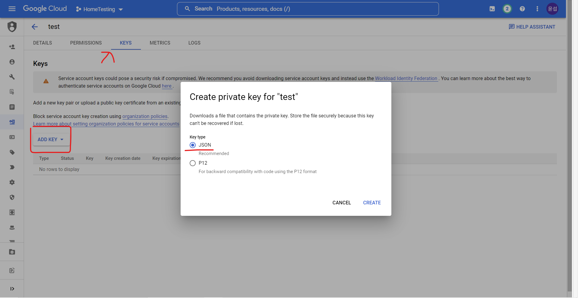 7. Keys 로 이동 후 JSON 형식의 키 생성
