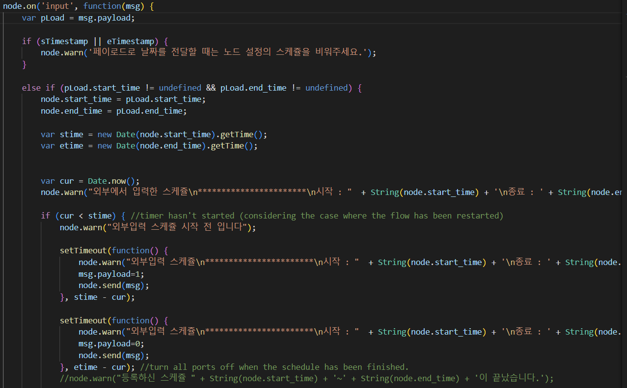 node.warn("등록하신 스케쥴\n***********************\n시작 : " + start + '\n종료 : ' + end + '\n***********************\n종료 시간이 이미 지났습니다.\n시간을 확인 후 재설정 해주세요.');