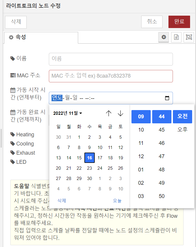 - 외부에서 시간 값을 input할 때는 노드 내의 schedule 설정을 사용 안 하므로 비워두도록 메시지 출력