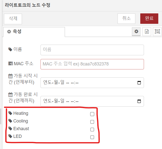 기본 상태에서는 mqtt에 정상적으로 접속하지만, 노드 내에서 Mac address 나 schedule을 입력하면
