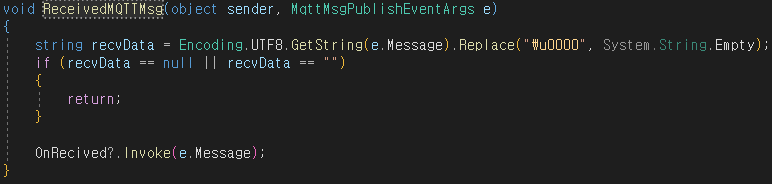 A 구간에서, MQTT 메시지 수신 이벤트 함수다.
